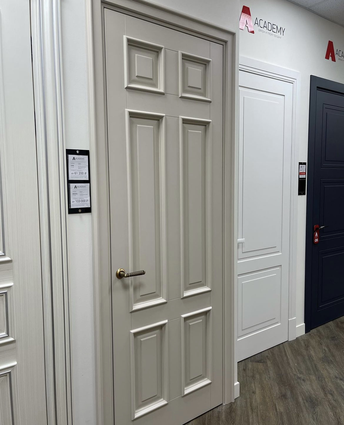 Полотно тамбуратное из инженерного массива (МДФ + ламельный/листельный массив лиственных пород) толщиной 50 мм. с повышенной шумоизоляцией,окра шенное матовыми красками итальянского производства SIRCA с эффектом «soft touch» по шкале RAL с возможностью двусторонней окраски. Объемные филенки, стекла крепятся к полотну с помощью фигурных штапиков (багетов).