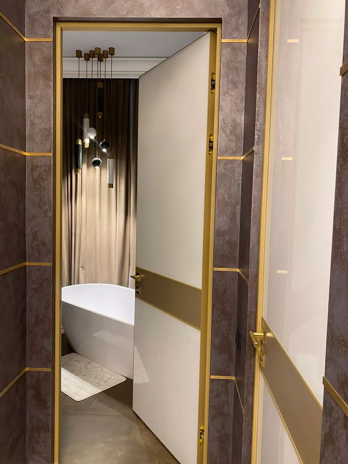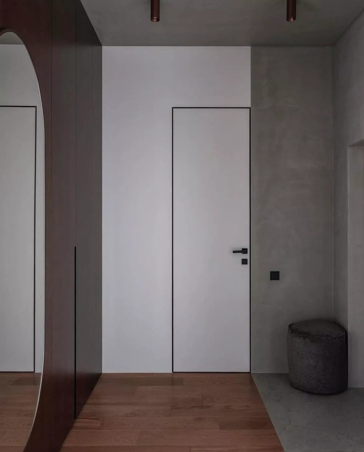 • Двери-невидимки: Двери могут сливаться с интерьером, создавая единое пространство. Добиться эффекта можно если дверной блок будет выполнен в идентичном со стеной цвете или отделке, либо за счет стеновых панелей которые будут повторять отделку двери или фрезеровку, выполненную на полотне.