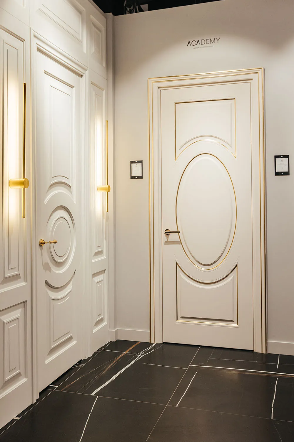 - Классика: филенчатые двери или багетные коллекции с резными элементами, украшенные патиной золотого или бронзового оттенка.